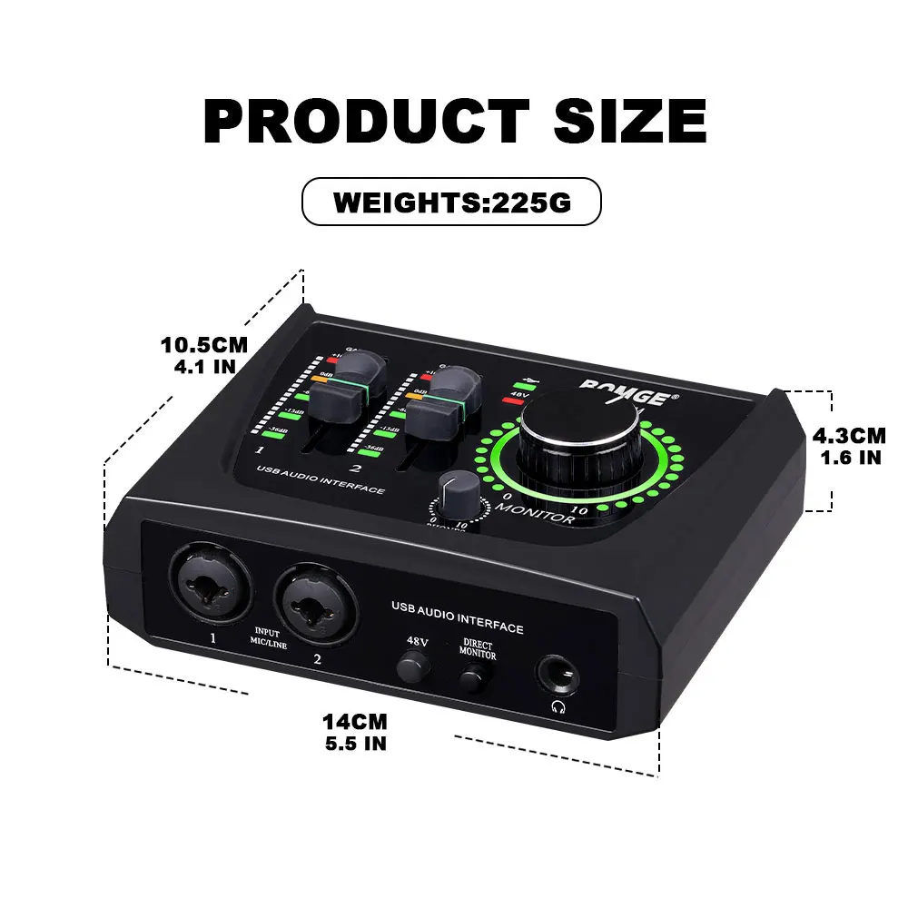 The portable audio interface has 2i2 jacks: 2 combo XLR/MIC/LINE inputs with phantom power for recording guitar, vocals or line-in signals. 2 independent RCA stereo jacks connect PA speakers, powered monitors, amplifiers and recording equipment. You can also choose RCA TRS (balanced connection) and TS (unbalanced connection) to connect different devices.